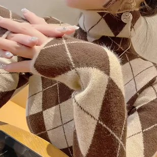 TEMU Elegancki Sweter Damski z Wysokim Kołnierzem w Kratę - Ciepło na Zimę, Czarno-Biały Piesek , Dopasowany Krój, Pranie Maszynowe, Tunika