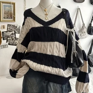TEMU Elegancki Sweter w Paski dla Kobiet - Miękki Sweter z Długim Rękawem na Każdą Porę Roku, Luźny Krój od Casual po Biznesowy,