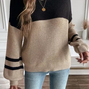 TEMU Elegancki sweter z blokami kolorów dla kobiet - okrągły dekolt, luźny krój, długi rękaw, beżowy i czarny, idealny na wiosnę/jesień, styl , top |