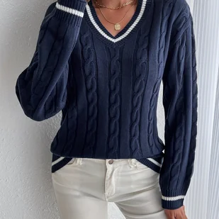TEMU Elegancki sweter z dekoltem w kształcie litery V i prążkowanym wykończeniem, zapinany na guziki, z opadającymi ramionami - detale w kształcie