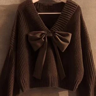 TEMU Elegancki Sweter z Kokardką - Miękka Zimowa Kurtka, Brąz (Czarny na Zdjęciu) Dzianina na Jesień i Zimę, Styl Meilade, Pranie Ręczne/Czyszczenie