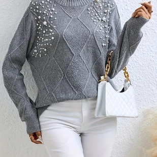 TEMU Elegancki szary sweter z pół wysokiego kołnierza Ozdobione perłami ramiona, luksusowy element garderoby dojazdowej, idealny na jesień i zimę