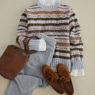 TEMU Elegancki Wielokolorowy Sweter w Paski dla Kobiet - Miękka Kurtka Sweter w Kształcie H z Okrągłym Dekoltem i Kołnierzem,