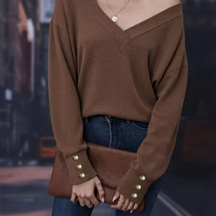 TEMU Elegancki, wygodny sweter bez ramiączek z dekoltem w serek Casualowy długi rękaw z detalami na guziki, sezon wiosna/jesień