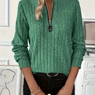 TEMU Elegancki Zielony Sweter Tunika Dla Kobiet - Wysoki, Jednokolorowy na Jesień/Zimę z Pełną Suwakiem Przodu, Okrągły Kołnierzyk i Bufiaste Rękawy