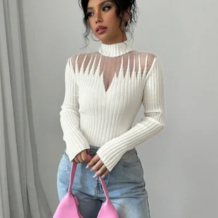 TEMU ELEGANTSUT Damski Seksowny Elegancki Półprzezroczysty Sweter z Koronki - Dopasowany Krótki Rękaw (Bez Objętości) Stójka Wysoka Elastyczność