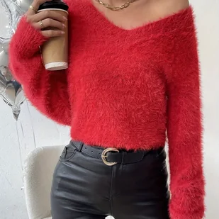 TEMU Damski sweter z długim rękawem i dekoltem w serek w jednolitym kolorze