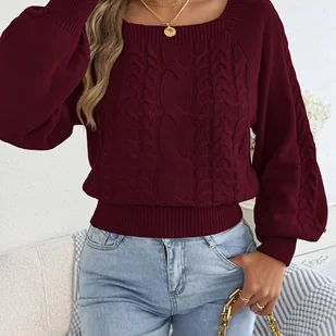 TEMU Jesień- Casual Wakacyjny Jednokolorowy Sweter z Kwadratowym Dekoltem, Twist, Wszechstronny, Długi Rękaw, Z Pasem