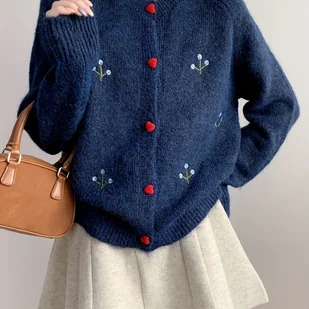 TEMU Jesień/ Japońsko-Koreański Styl Elegancki Casual Okrągły Dekolt Kwiatowy Haft Długi Rękaw Miękki Sweter Kardigan Płaszcz Damski