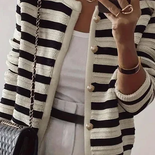 TEMU Kardigan Damski Elegancki w Czarne i Białe Paski - Długi Rękaw z Zapięciem na Guziki, Kołnierz i Pasek do Zapinania - Ciepły Sweter na Jesień i