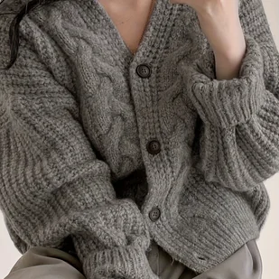 TEMU Kardigan Damski w Kolorze Szarym z Dekoltem V – Elegancki, Luźny Sweter na Zimę i Jesień z Guzikami, Pranie Maszynowe, Wygodna Warstwa dla