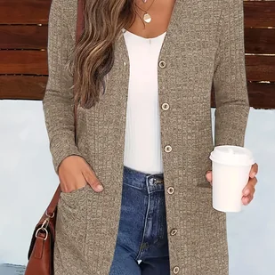 TEMU Kardigan Damski z Dekoltem w Serek i Kieszeniami Bocznymi - Pralny Sweter na Jesień/Zimę, Jednokolorowy Komfortowy Dodatek Warstwowy, Uroczy