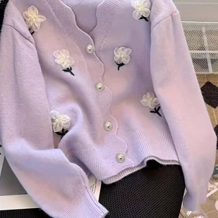 TEMU Kardigan Damski z Dekoltem w Serek Lavender - Elegancki Sweter na Wiosnę/Jesień z Haftowanymi Kwiatami 3D i Perłowymi Guzikami, Średnio