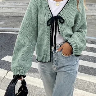 TEMU Kardigan Damski z Eleganckim Kolorowym Blokiem i Wiązaniem na Przodzie - Lekka Dzianina 100% Poliestrowa, Możliwość Prania w Pralce, Casualowa