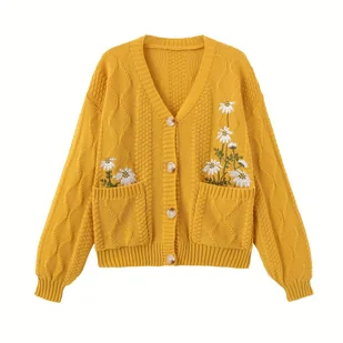 TEMU Kardigan Damski z Haftem Kwiatowym, Casualowy Z Kieszeniami i Guzikami na Przód – Sweter Jesienny z Długim Rękawem