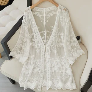 TEMU Kardigan Kimono z Koronką w Stylu Boho dla Kobiet - Lekki, Szydełkowy Pokrowiec Plażowy z Haftem Kwiatowym, Luźny Krój z Półrękawami na Wiosnę/,