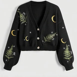TEMU Kardigan z Eleganckim Dekoltem w Serek dla Kobiet z Wzorem Księżyca i Gwiazd - Ciemnoniebieski, Długi Rękaw, Zapinany na Guziki, Moda