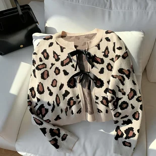 TEMU Kardigan z Eleganckim Wzorem Lamparta dla Kobiet z Przednim Wiązaniem - Beżowo-Brązowy Zwierzęcy Nadruk, Długie Rękawy, Żebrowane Mankiety,