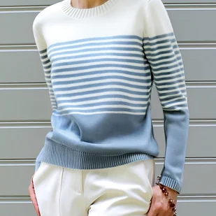 TEMU Kasualowa Pasiasta Bluzka Damska - Kolorowy Blok, Długi Rękaw, Okrągły Dekolt, Jasnoniebiesko-Białe Paski, Miękka i Wygodna na Wiosnę/Jesień,