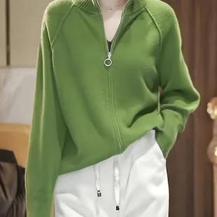 TEMU Kobiecy Przytulny Zielony Kardigan - Casualowy Długi Rękaw, Zamek Błyskawiczny, Stójka, Luźny Krój, Guziki, Idealny na Jesień i Zimę, Casualowa