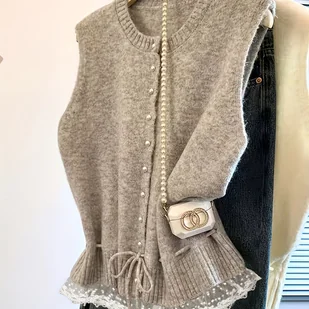TEMU Elegancka Warstwowa Kamizelka Kardigan z Perłowymi Guzikami i Koronką w Stylu Koreańskim na Codzienne Noszenie i Randki