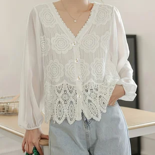 TEMU Lekki szifonowy kardigan damski z długim rękawem, z etnicznym wzorem szydełkowym, dekoltem w serek i koronkową osłoną. Idealny do warstwowania