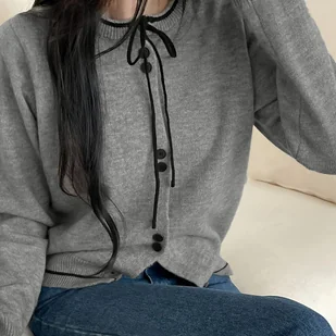 TEMU Modny Kardigan Y2g z Długim Rękawem i Kokardką – Jednokolorowy, Zapinany na Guziki, Wygodna Mieszanka Poliestru dla Kobiet – Idealny Wybór na