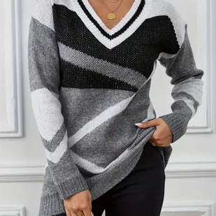 TEMU Nowy damski modny wszechstronny swobodny geometryczny kolorowy blokowy dzianinowy sweter