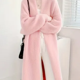 TEMU Nowy luksusowy płaszcz o długim kształcie z pluszową teksturą na rok 2025 Elegancki, luźny, gruby kardigan na jesień/zimę