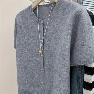 TEMU Nowy szary kardigan z krótkim rękawem 2025 Elegancki okrągły dekolt, jednolity , złote guziki, uniwersalny do dojazdów do pracy, idealny na