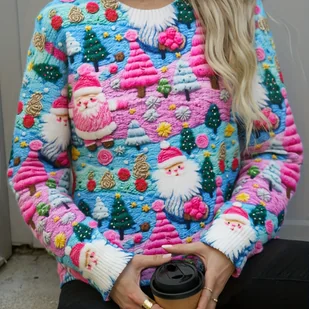 TEMU Sweater świąteczny dla kobiet - Przytulny sweter z prezentem, różowym i niebieskim kolorami świątecznymi - Sweter z okrągłym dekoltem na