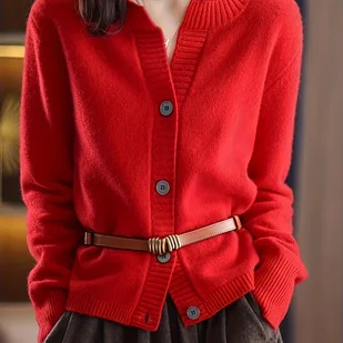 TEMU Sweter damski casualowy - żywa czerwień, luźny krój z otwartym przodem i złotymi guzikami oraz paskiem, okrągły dekolt, lekki sweter na każdą