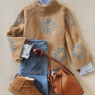 TEMU Sweter Damski Elegancki - Luźny Fason z Długim Rękawem, Kolorowy Blok Brązowo-Niebieski na Wiosnę/Jesień, Codzienny i Formalny Styl, Okrągły