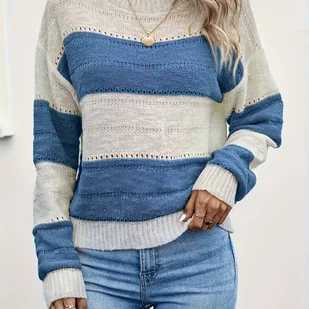 TEMU Sweter Damski Elegancki – Nieelastyczny Pullover w Kolorach Niebieskim i Beżowym, Okrągły Dekolt, Casualowy i Stylowy na Codzienność oraz Na