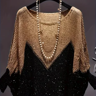 TEMU Sweter Damski - Rękawy Batwing, Luźny Krój w Kolorze Beż/Czarny, Półprześwitujący Sweter na Wiosnę/Jesień/, Codzienny i Formalny Styl, Letni
