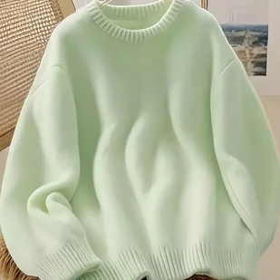 TEMU Sweter Damski w Kolorze Miętowej Zieleni - Luźny Krój z Długim Rękawem i Okrągłym Dekoltem, Średnio Elastyczna Wygodna Bluzka na Jesień/Zimę,