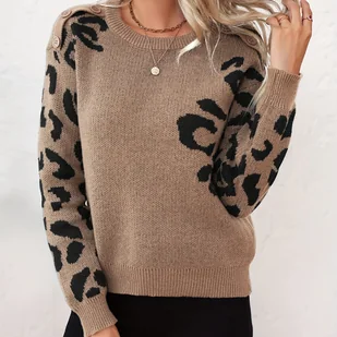 TEMU Sweter damski w leopardzie - Elegancki beżowo-czarny wzór zwierzęcy, wygodny sweter na jesień/zimę do codziennych i formalnych stylizacji,