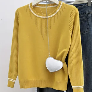 TEMU Sweter Damski w Musztardowe Paski z Koronką – Elegancki Sweter z Okrągłym Dekoltem i Kontrastowymi Kołnierzykami, Średnio Elastyczny,
