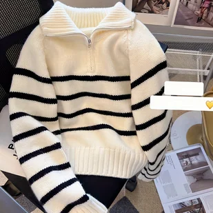 TEMU Sweter damski w paski z kontrastowymi klapami, jesień/, gruby, półzipowany, luźny i miękki sweter