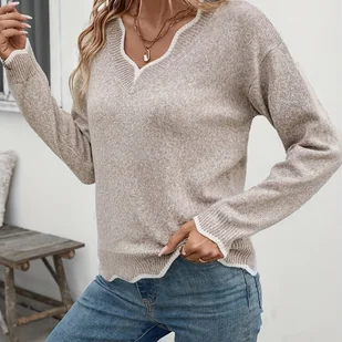 TEMU Damski Sweter z Długim Rękawem i Dekoltem w Serek - Miękki, Luźny, Stylowy i Casualowy Top