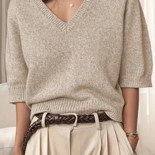 TEMU Sweter Damski z Dekoltem w Serek, Krótki Rękaw - Jednokolorowy, Luźny Fason, Miękka Oddychająca Bluzka na Wiosnę/, Minimalistyczny Design dla