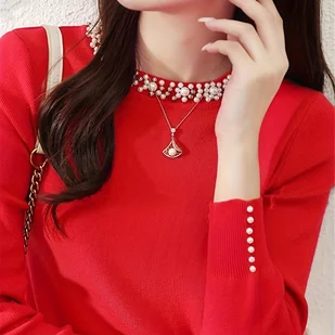 TEMU Sweter Damski z Długim Rękawem – Jednokolorowy, Elastyczny Pulower z Okrągłym Dekoltem i Akcentami Perłowymi, Casualowa i Elegancka Bluzka na
