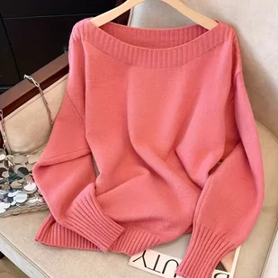 TEMU Sweter damski z eleganckim dekoltem typu boat neck - koralowy róż, luźny krój z ściągaczami na mankiety, średnia elastyczność, tylko pranie
