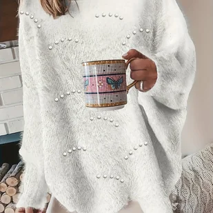 TEMU Sweter Damski z Eleganckim Luźnym Krojem i Perłowymi Ozdobami - Długi Rękaw, Okrągły Dekolt, Miękka Biała Bluzka na Wiosnę/Jesień, Casualowy