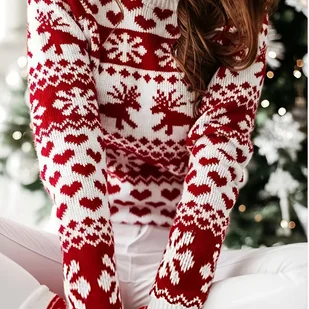 TEMU Sweter Świąteczny dla Kobiet w Czerwono-Płowym Kolorze z Wzorem Płatka Śniegu - Luźna Bluzka z Długim Rękawem, Okrągły Dekolt, Elegancki i