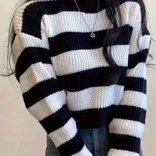 TEMU Pasiasty Sweter z Długim Rękawem dla Kobiet, Luźny Pulower na Jesień