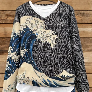 TEMU Sweter z Nadrukiem Wzoru Niebieskich Fal, Gruby Sweter z Dekoltem w Serek i Długim Rękawem – Casualowy, Odzież Damska