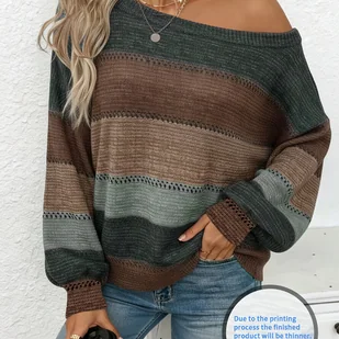 TEMU Swobodny sweter w paski z odkrytymi ramionami Luźne rękawy typu lantern, nadruk na całej powierzchni, średnio elastyczny materiał, idealny na