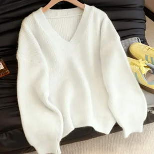 TEMU Unikalny, swobodny sweter w jednolitym kolorze z dekoltem w serek na jesień i zimę, miękki i przytulny, luźny i uroczy, idealny do łączenia z