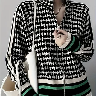 TEMU Wealth Elegancki Damski Sweter Kardigan w Kratę i Paski z Zamkiem - Długi Rękaw, Wysoki Kołnierzyk, Pranie Maszynowe, Casualowy Styl Zimowy,